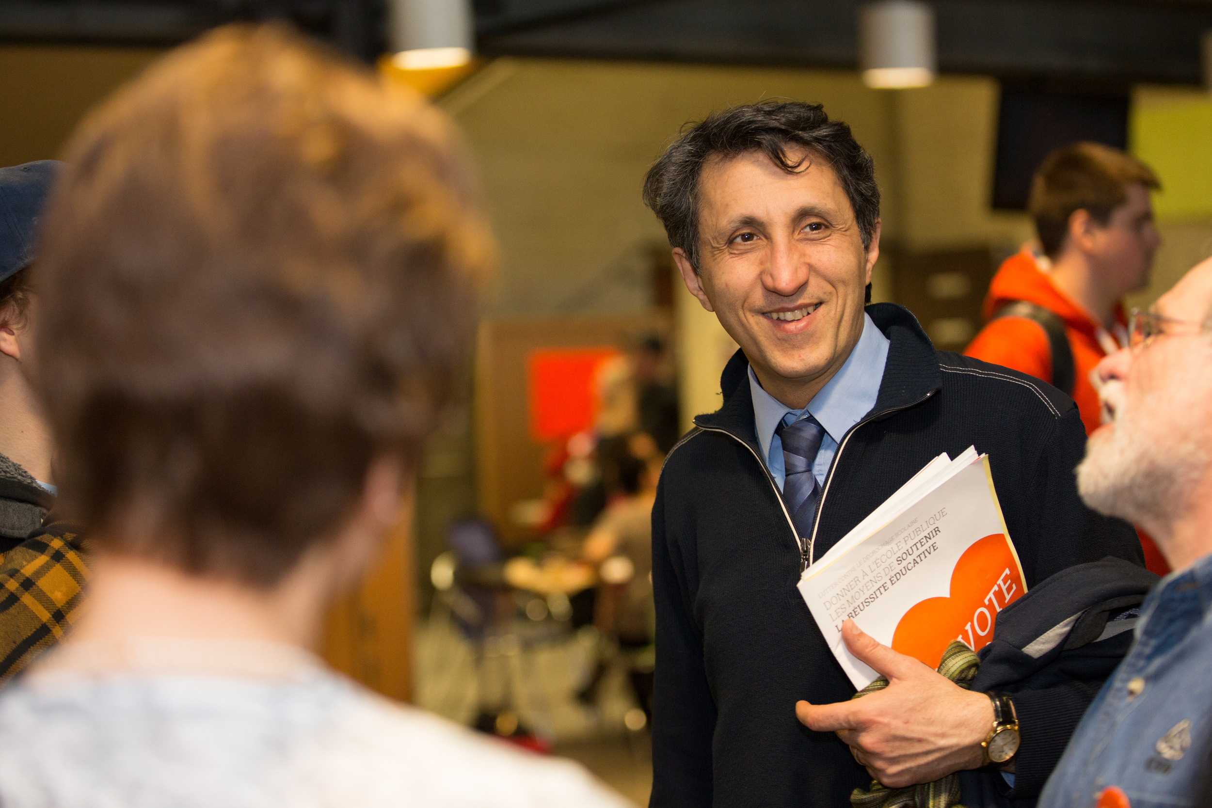 Amir Khadir, député de Québec solidaire à l'Assemblée nationale, visite les étudiant de l'Université du Québec à Chicoutimi.