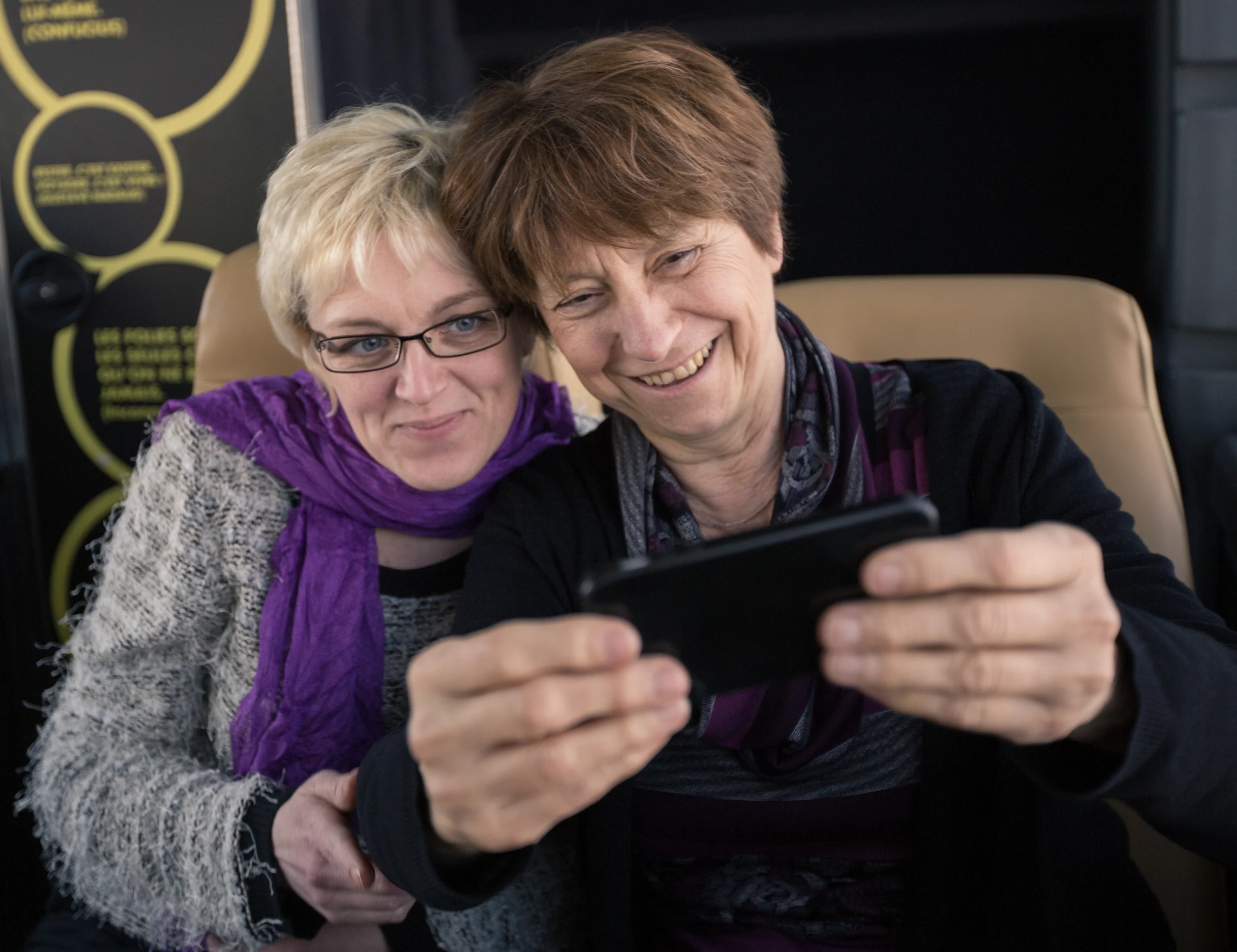 Françoise David, en pleine exécution d'un selfie, en compagnie de l'une des organisatrices de la tournée, Josée Larouche.